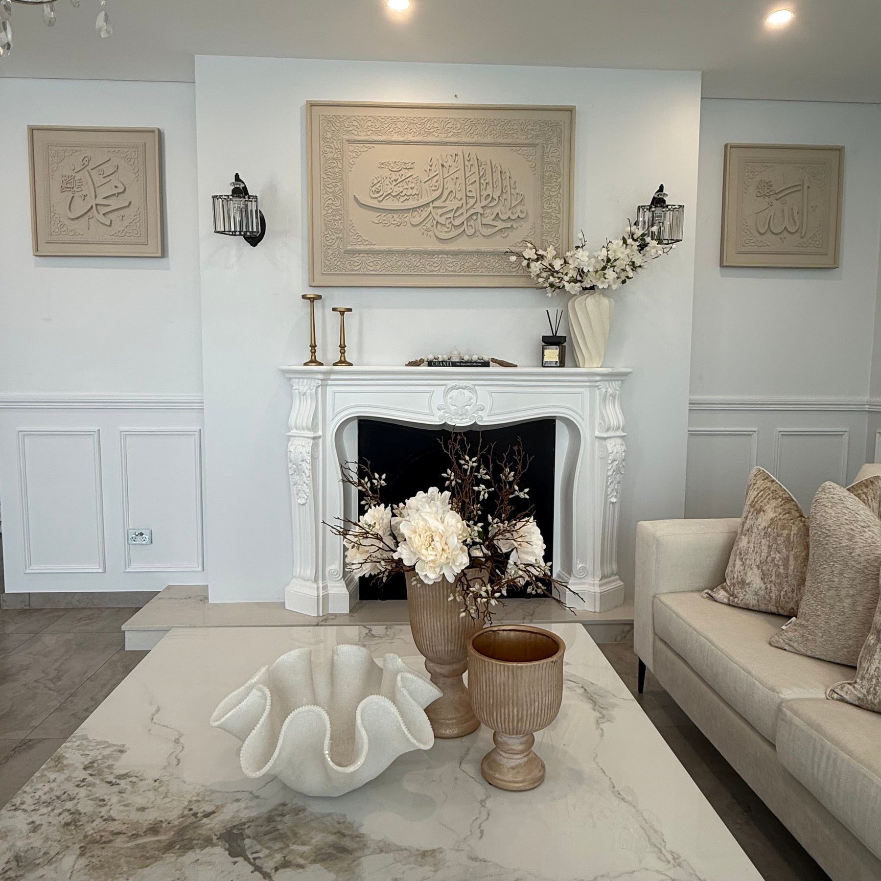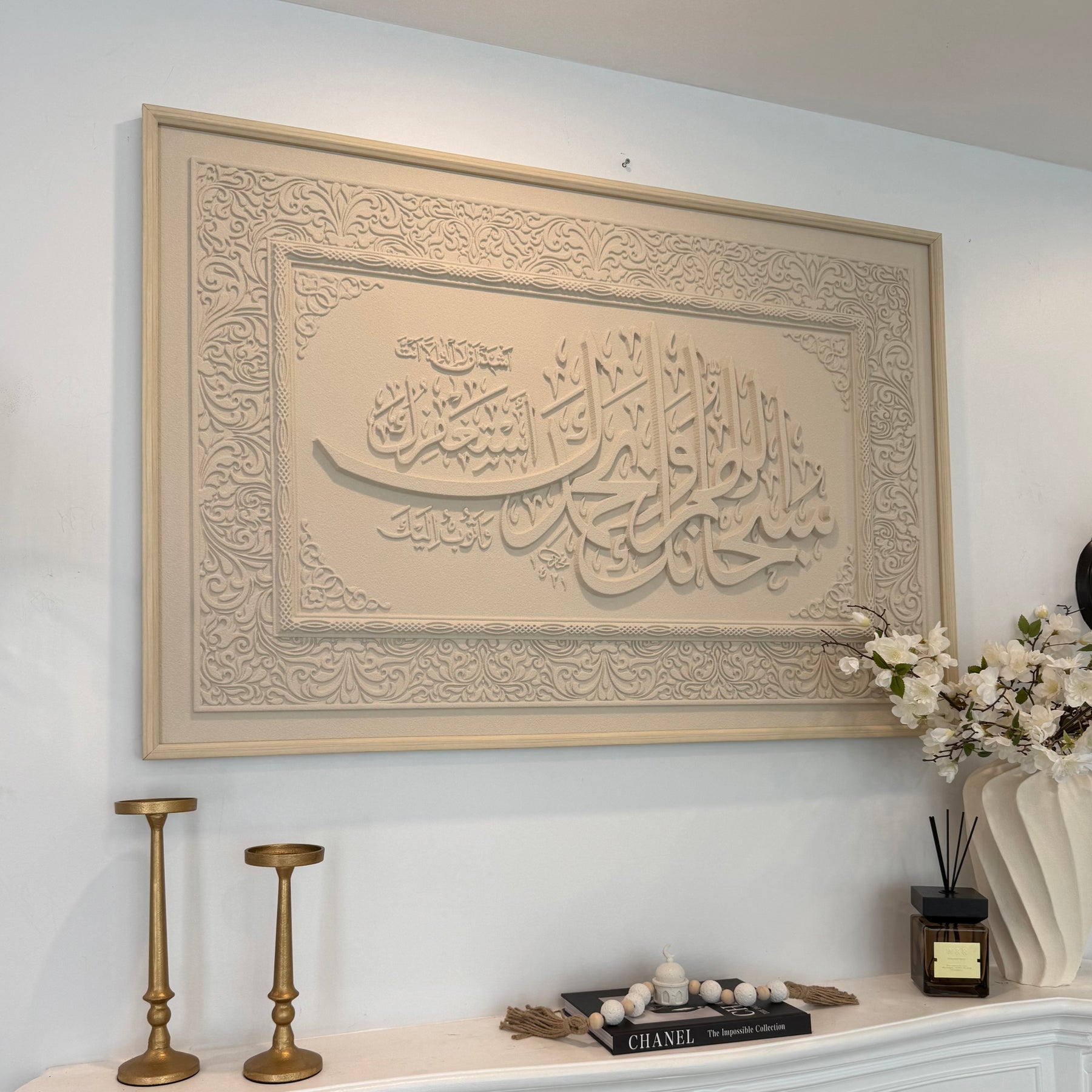 Stone effect beige calligraphy wall art light frame "Glorious You are O Allah, and with Your praise, and blessed is Your Name, and exalted is Your majesty, and none has the right to be worshipped but You."