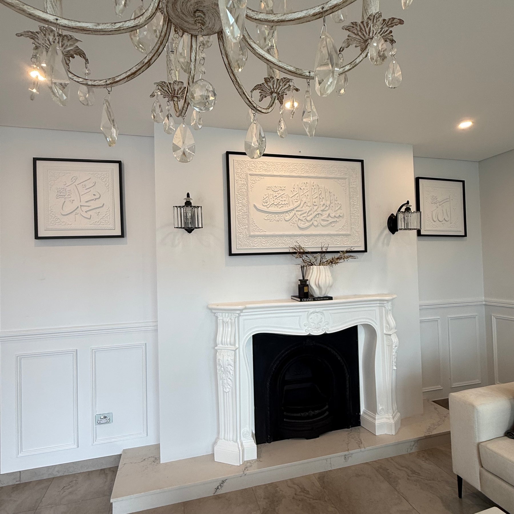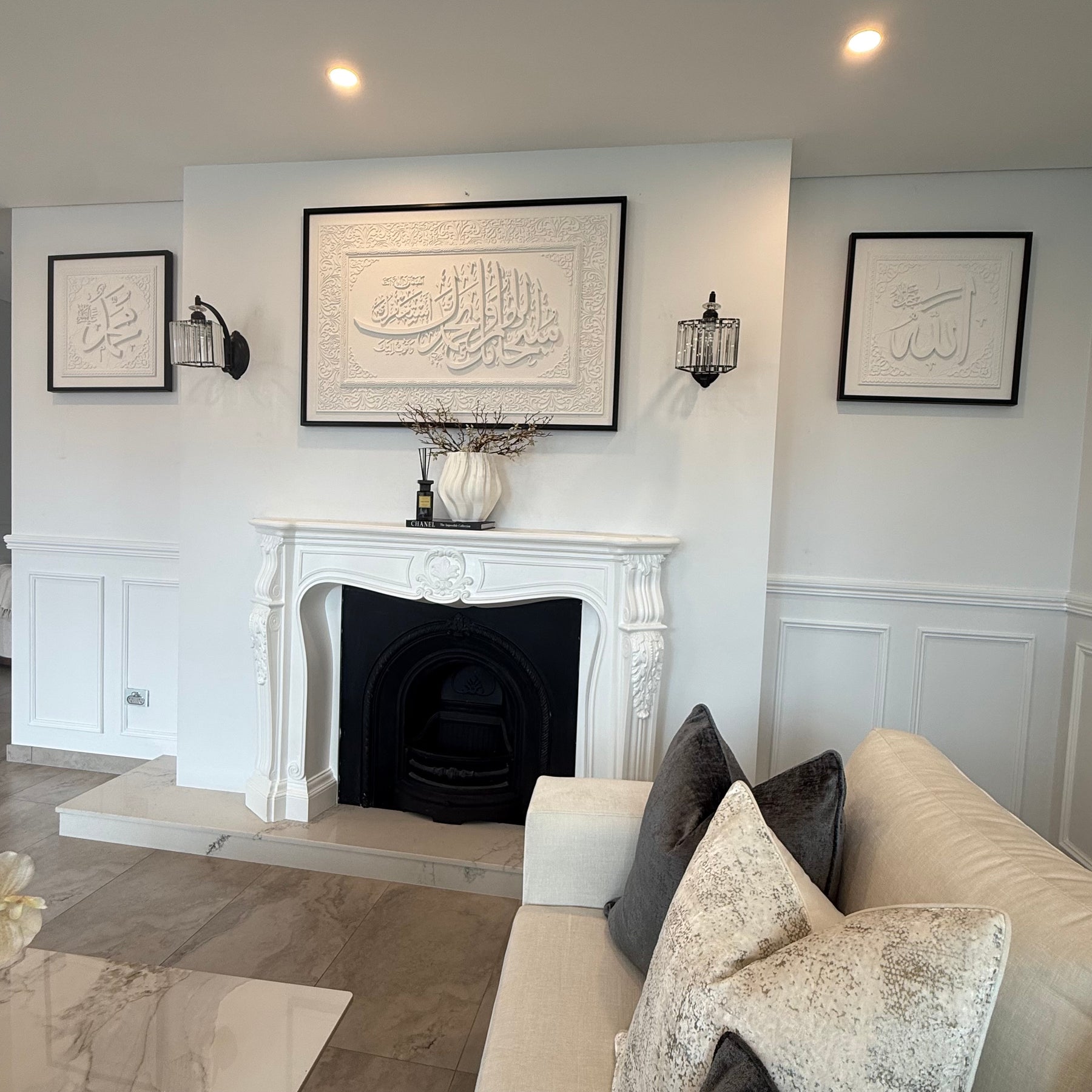 Stone effect calligraphy wall art black frame "Glorious You are O Allah, and with Your praise, and blessed is Your Name, and exalted is Your majesty, and none has the right to be worshipped but You."