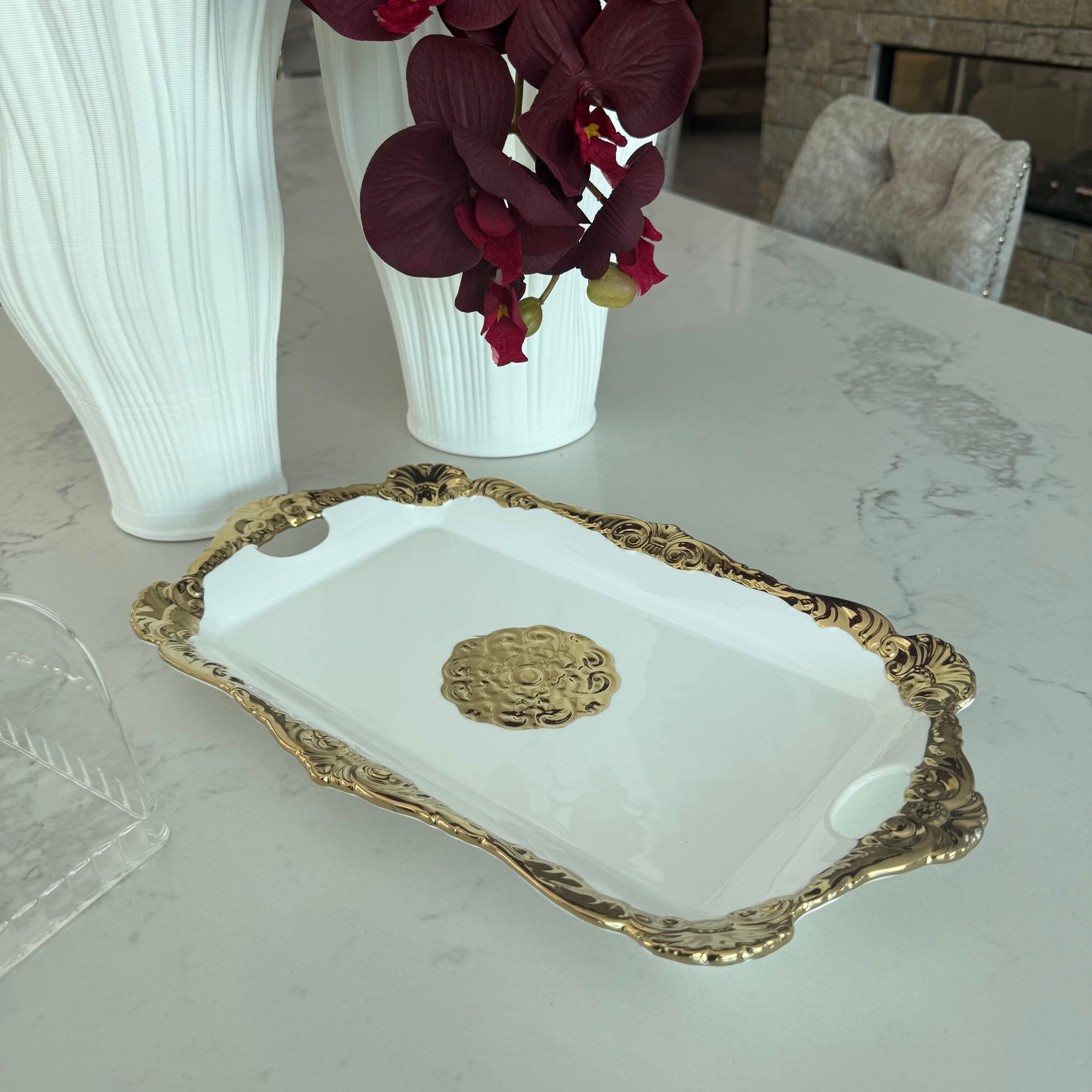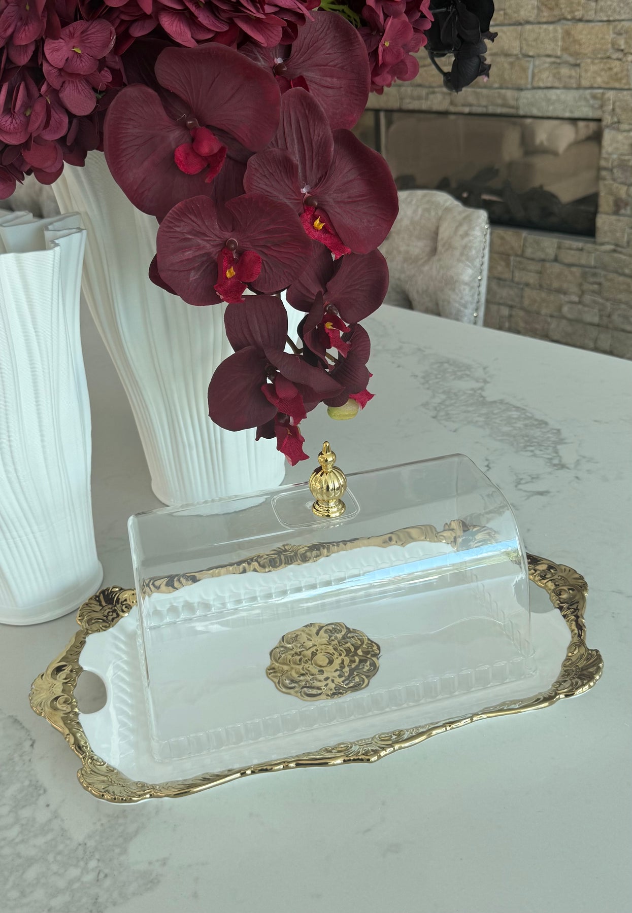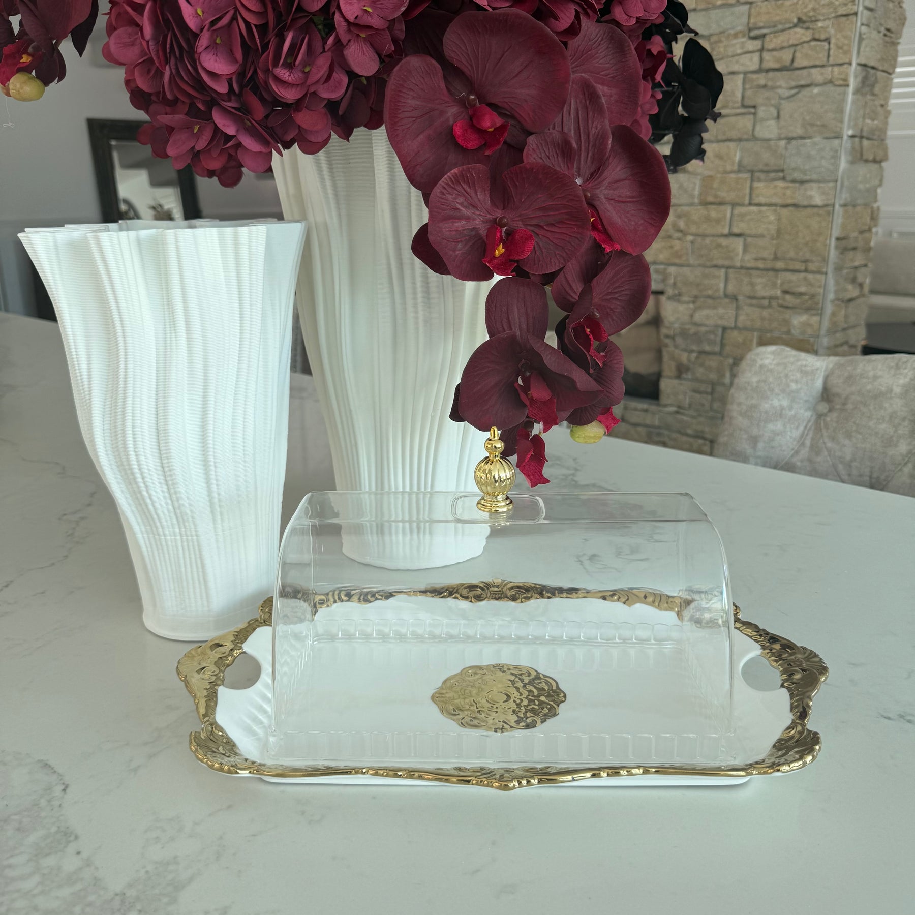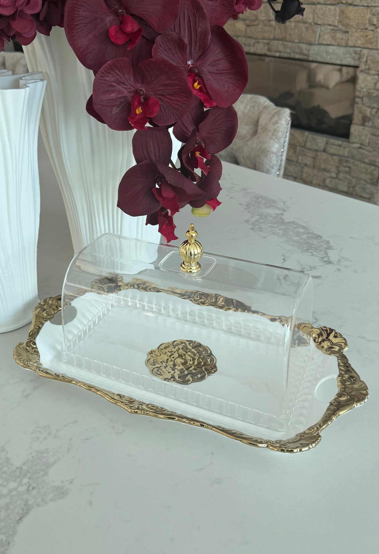 Royal oval white & gold platter / cake tray + dome