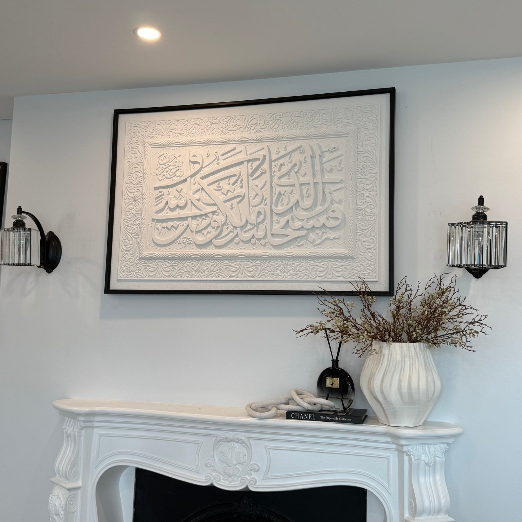 Stone effect calligraphy wall art black frame Surah Yasin (36:83) Glory be to Him in whose hand is the dominion of all things, and to Him you will be returned.