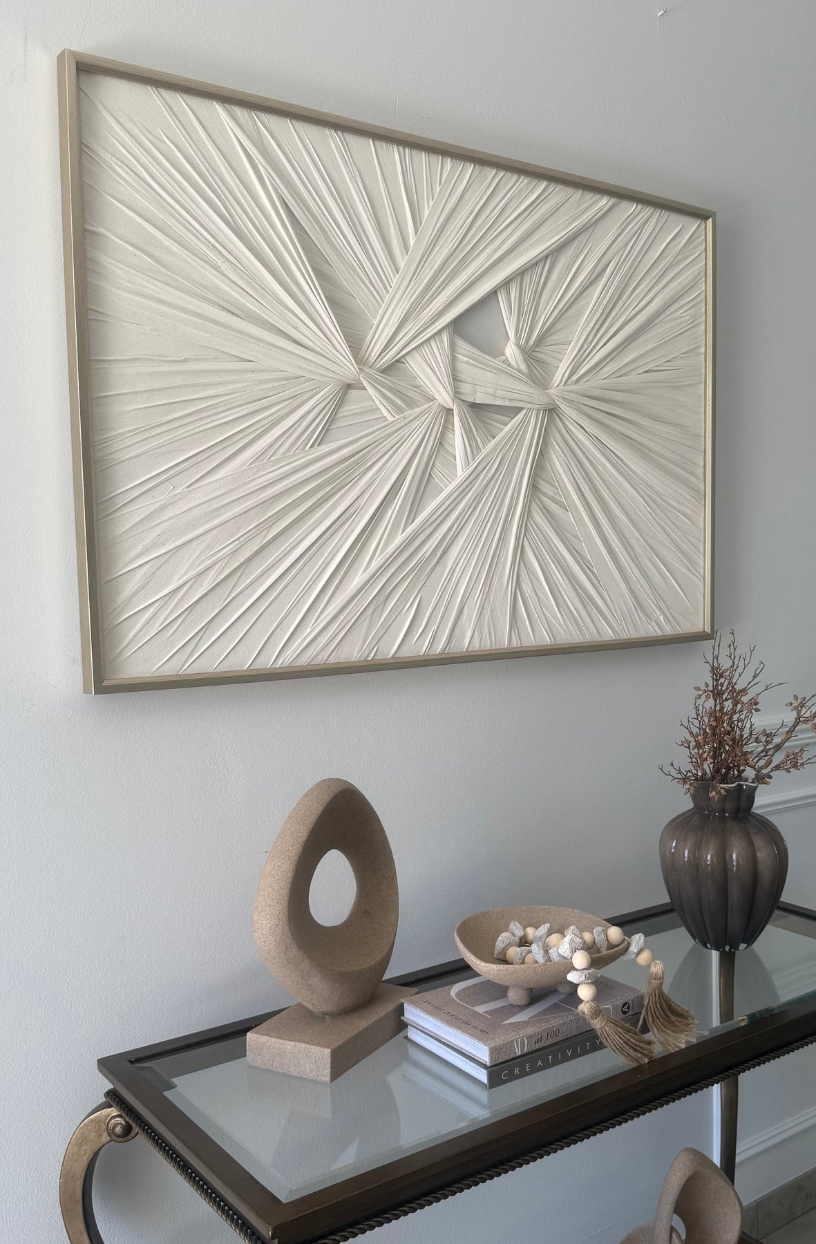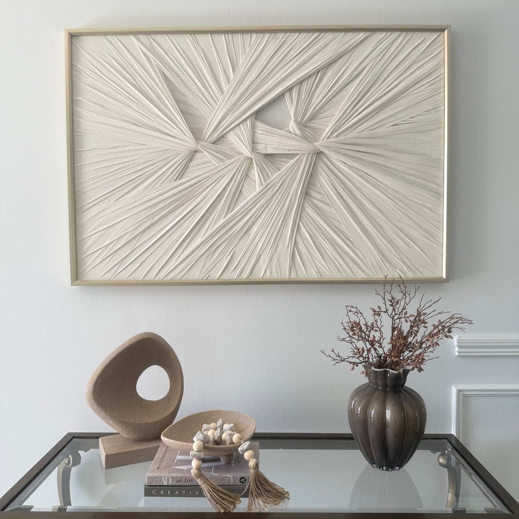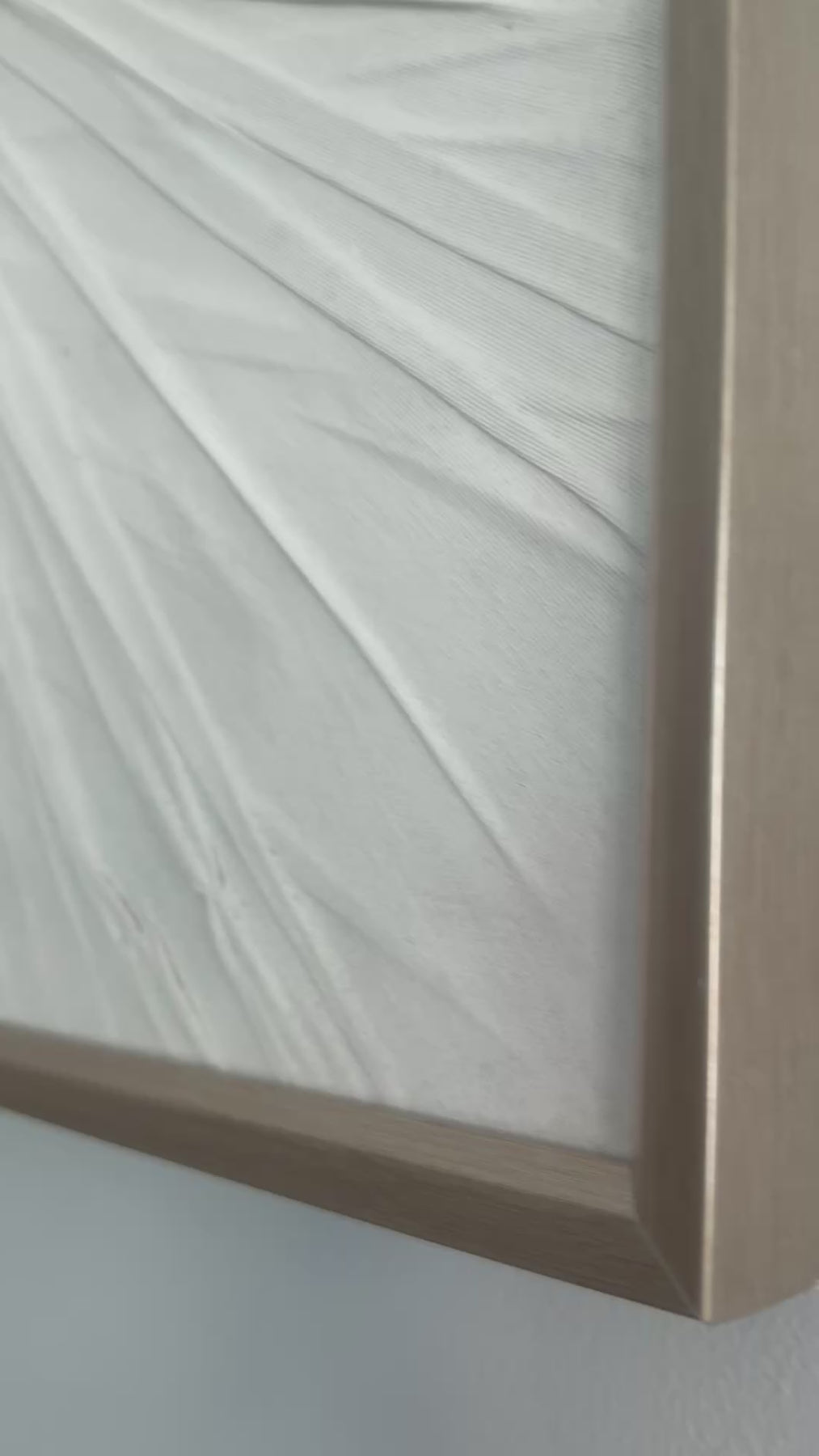 This is a framed wall art piece featuring elegantly draped fabric stretched in radiating patterns.