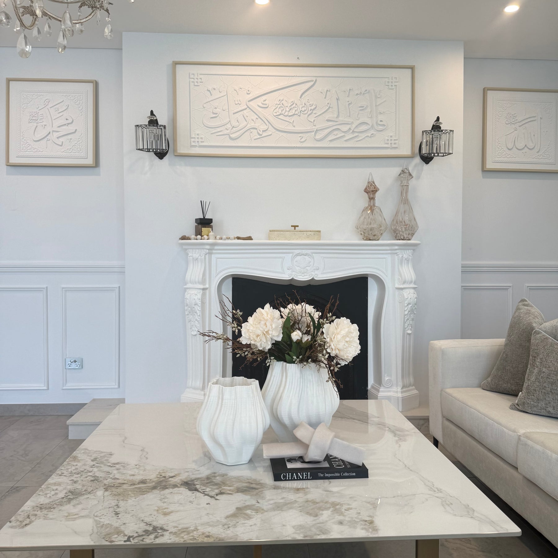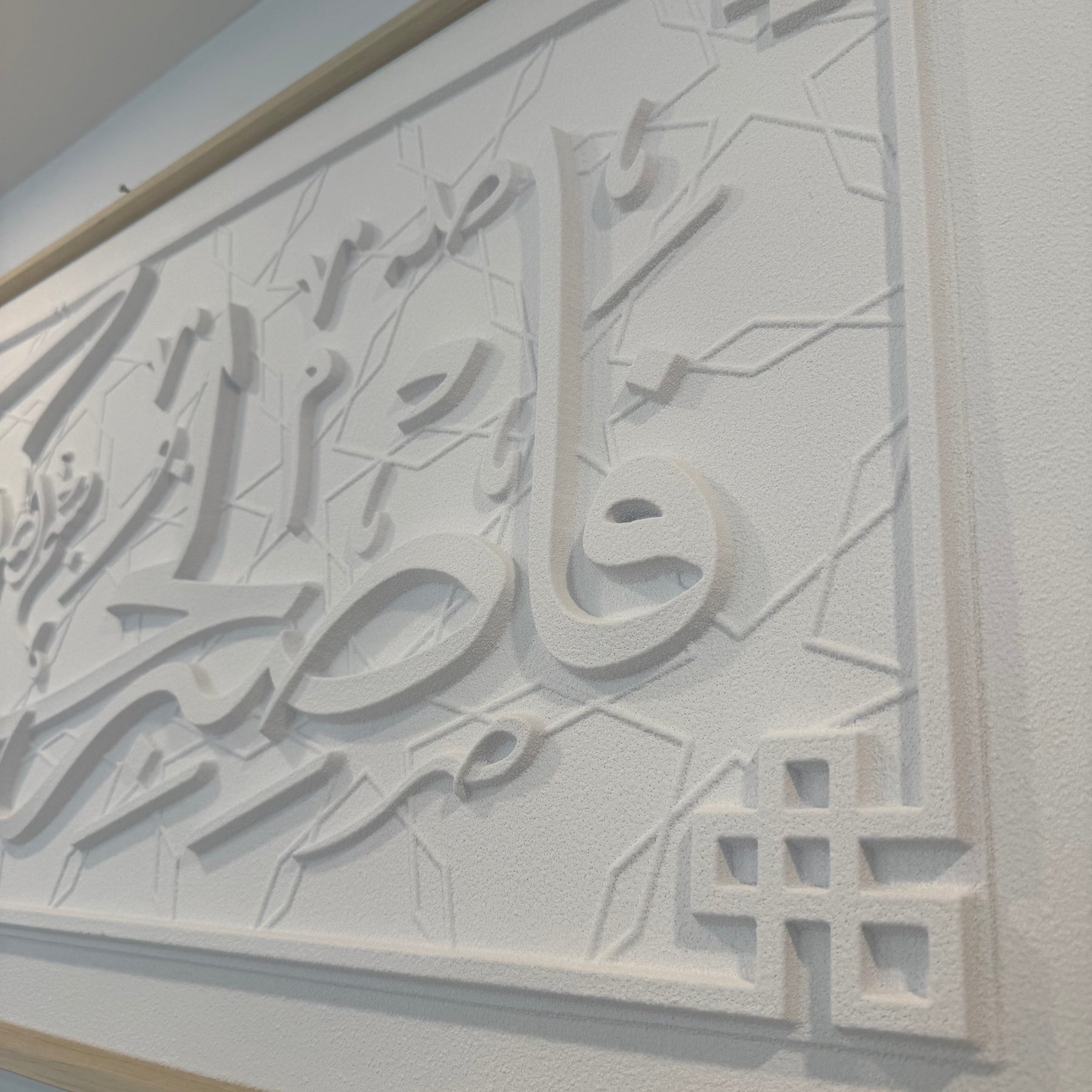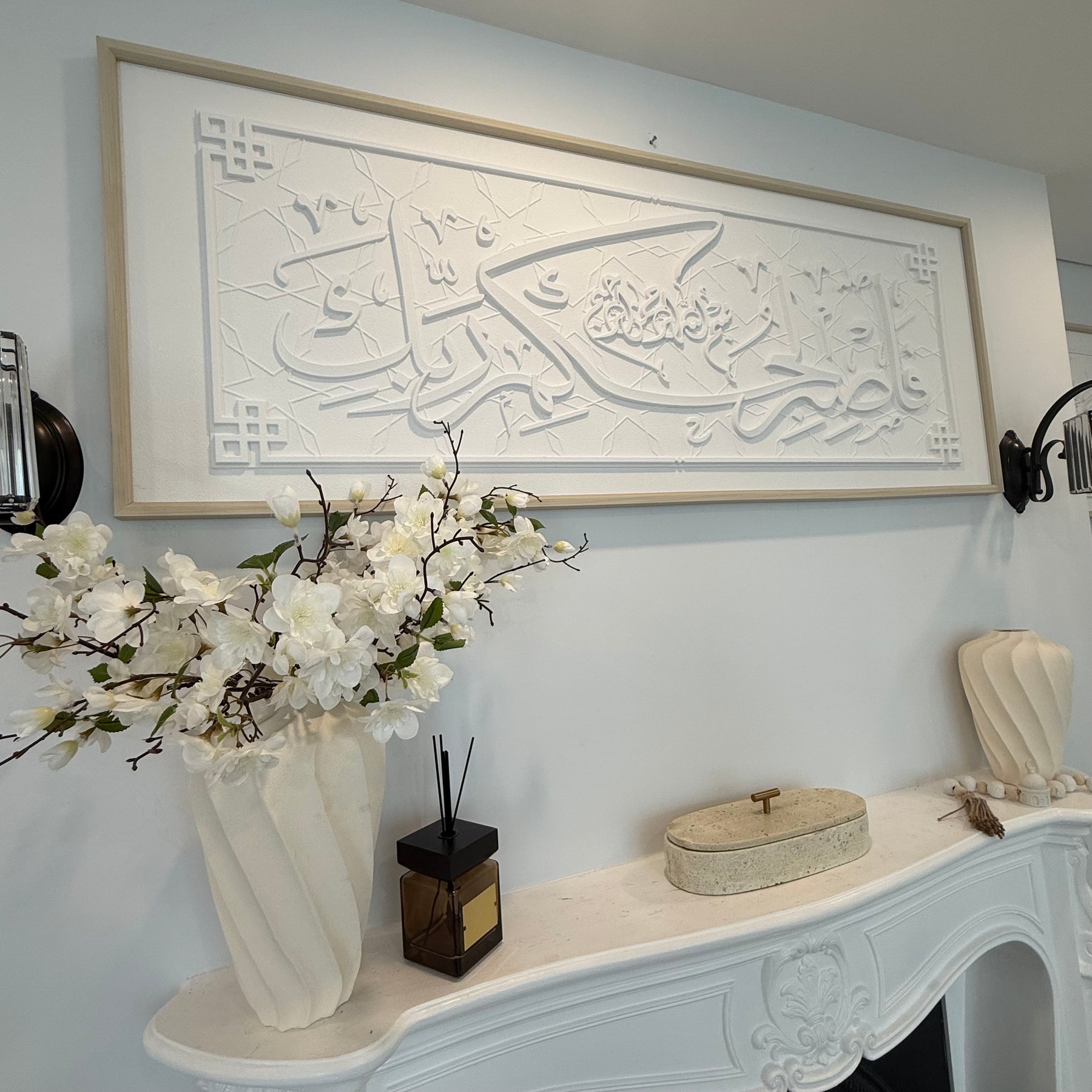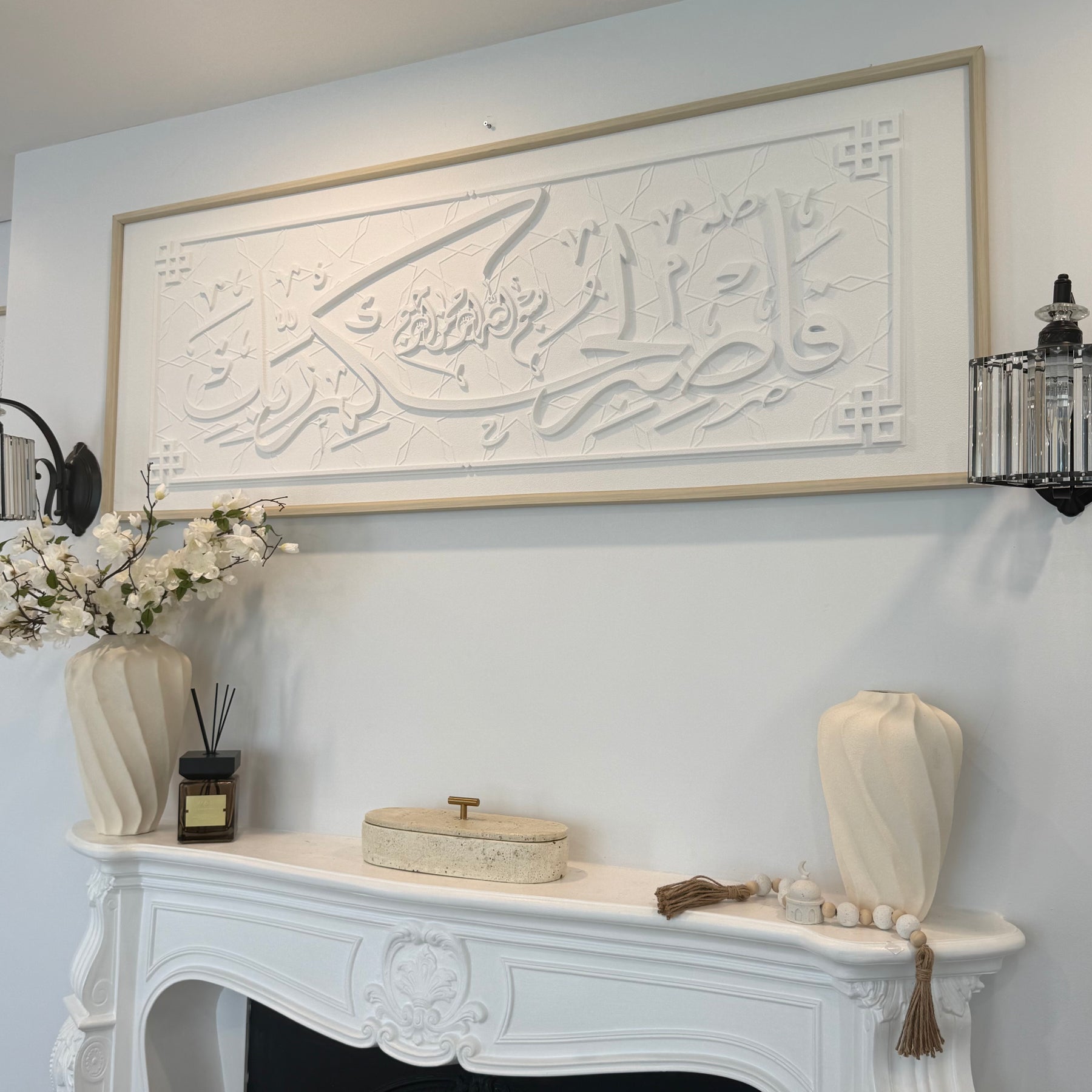 Stone effect calligraphy wall art light frame In the name of God, the Most Gracious, the Most Merciful. [So be patient for the judgment of your Lord.]