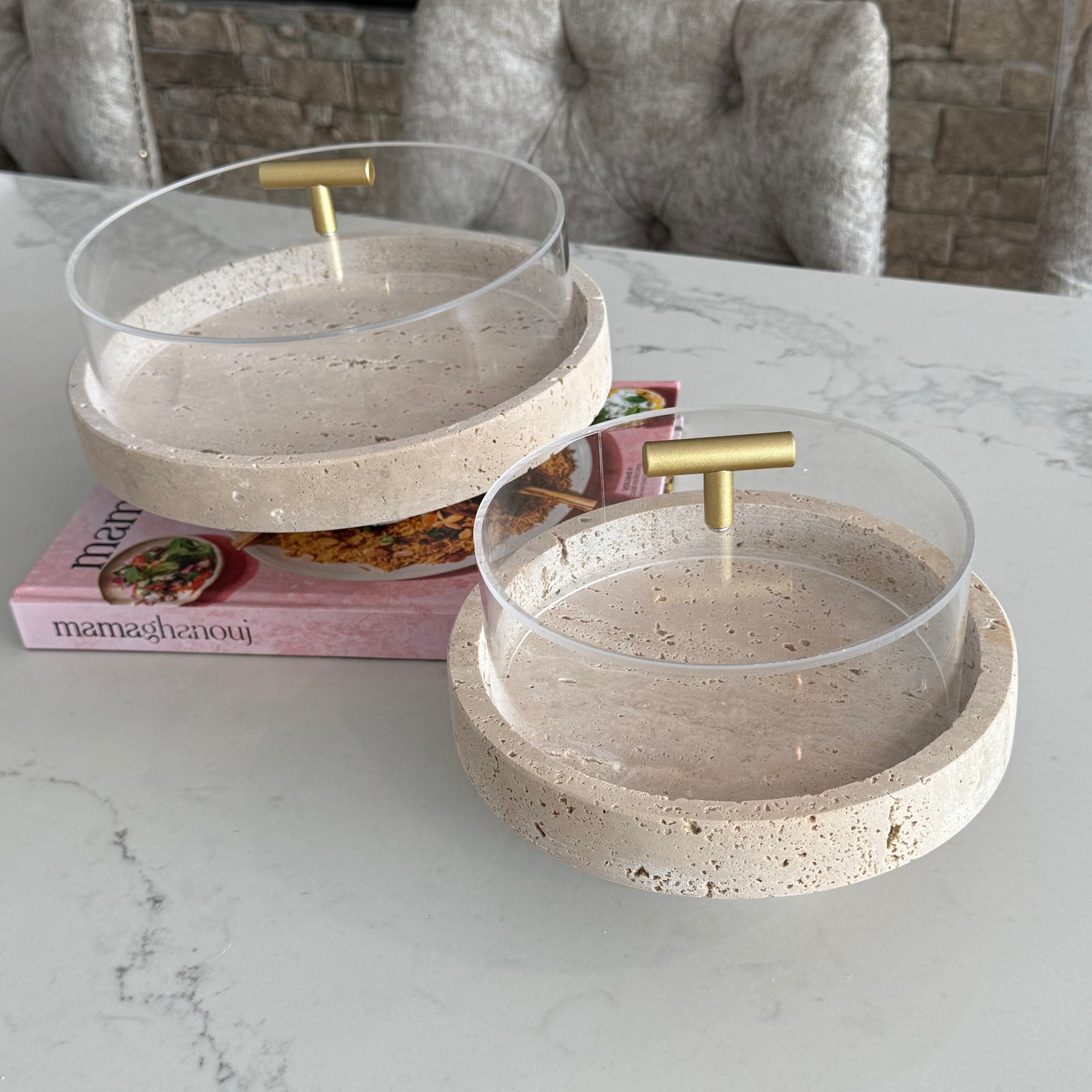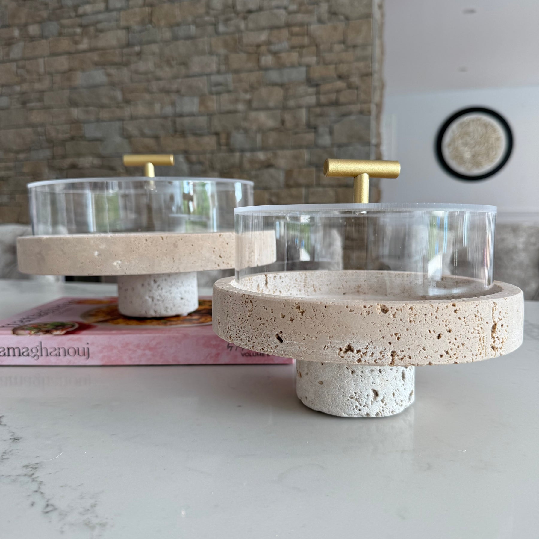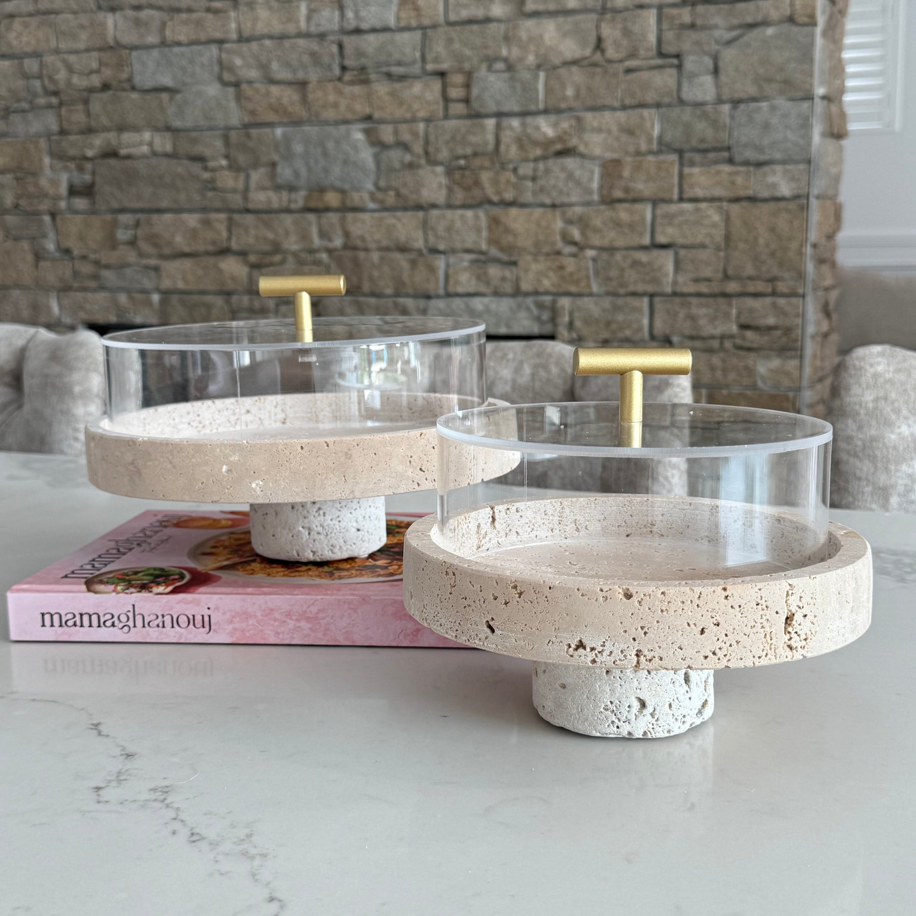 Travertine round cake stands + dome