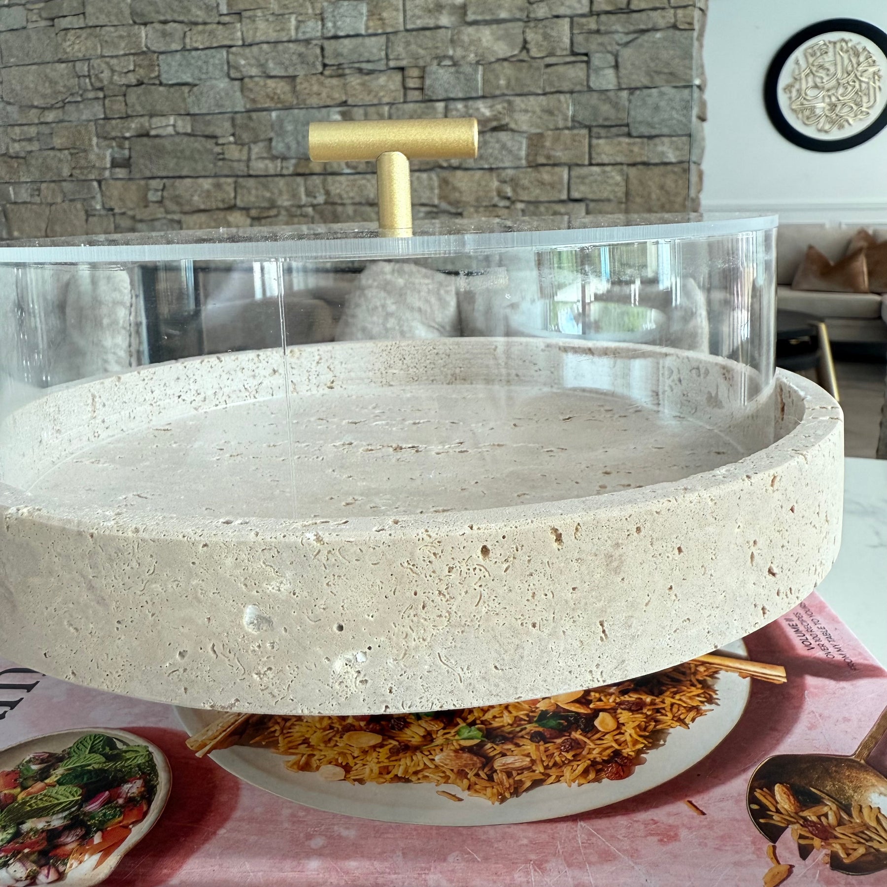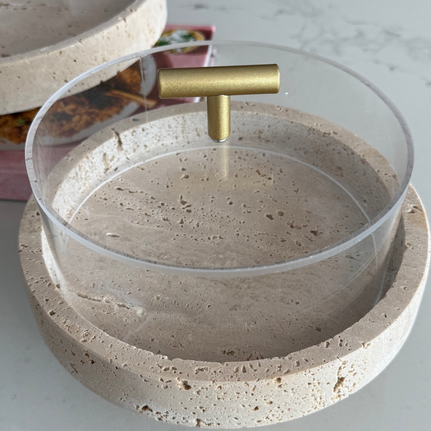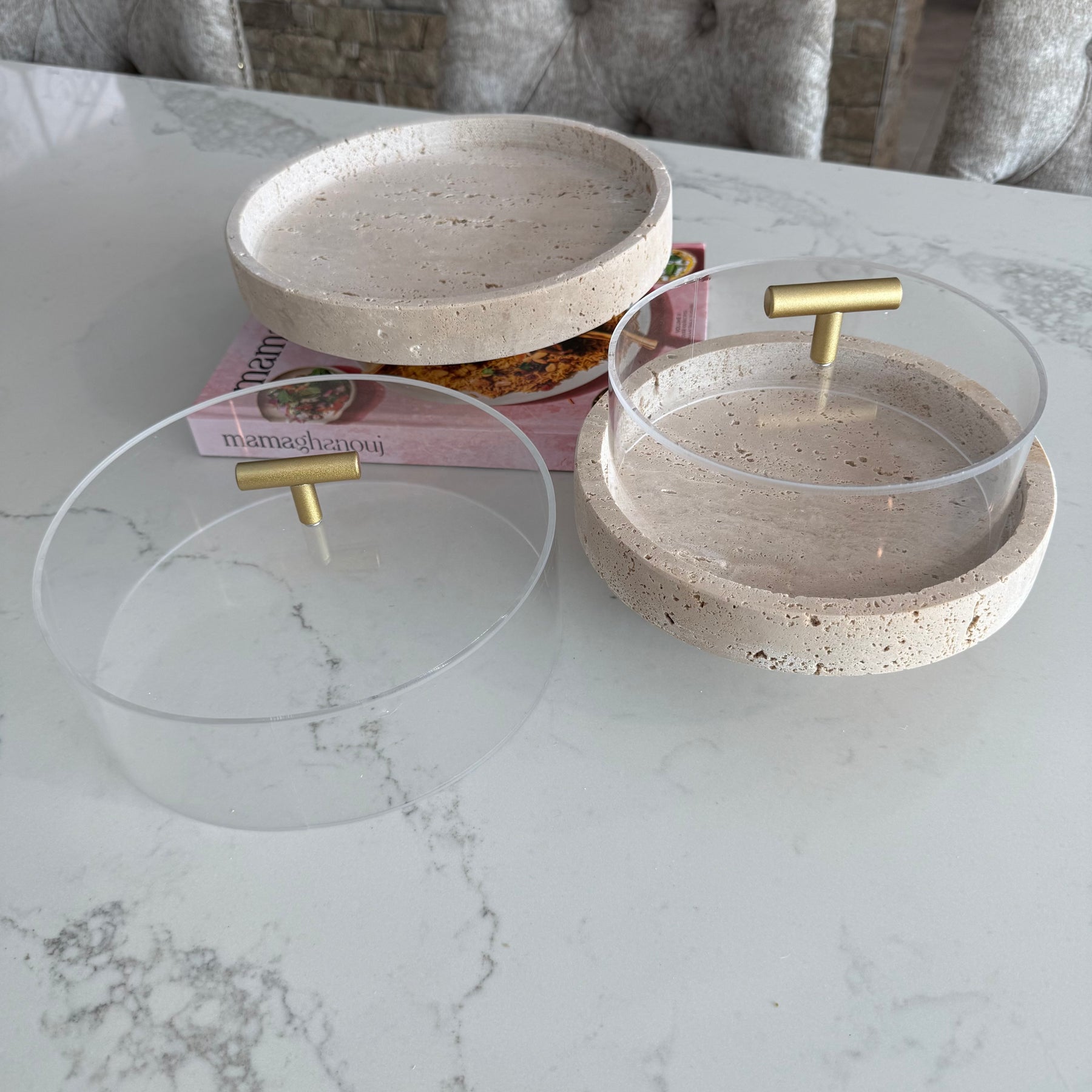 Travertine round cake stands + dome